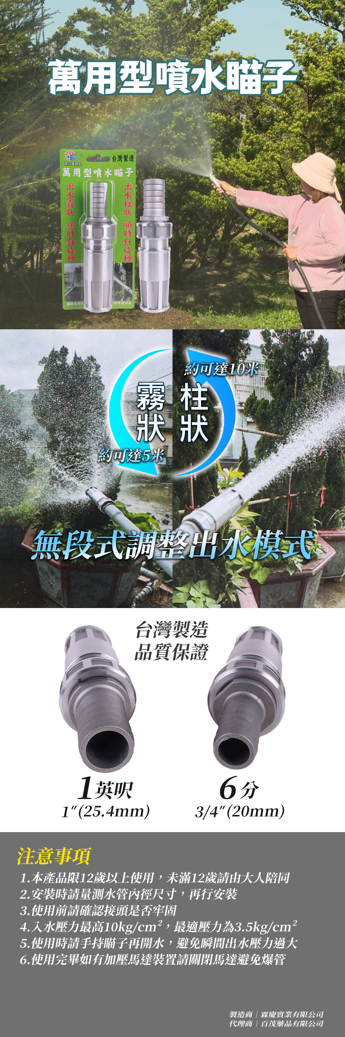 .園藝澆水灌溉、髒污清洗、消防滅火,出水量大 .搭配加壓馬達效果更加 .出水方式為柱狀、霧狀,多功能使用 .可用地下水、自來水或經過濾無雜質之水源 .產品為台灣工廠直營製造,品質耐用 .材質為鋁合金成型製造 .管尾可用一般水管或用自來水管插入,多功能安裝