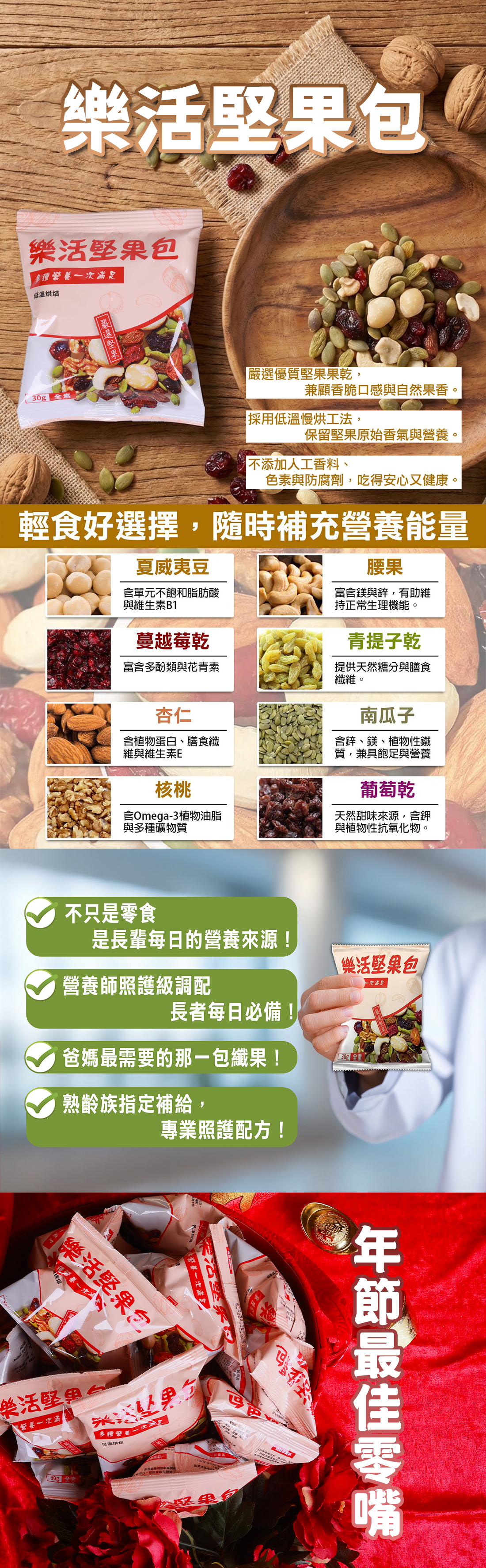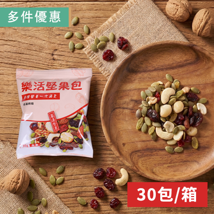 品名:樂活堅果包 成分:南瓜籽、葡萄乾、青提子、夏威夷豆、蔓越莓、杏仁、核桃、腰果 原產地:台灣 重量:30克/包
