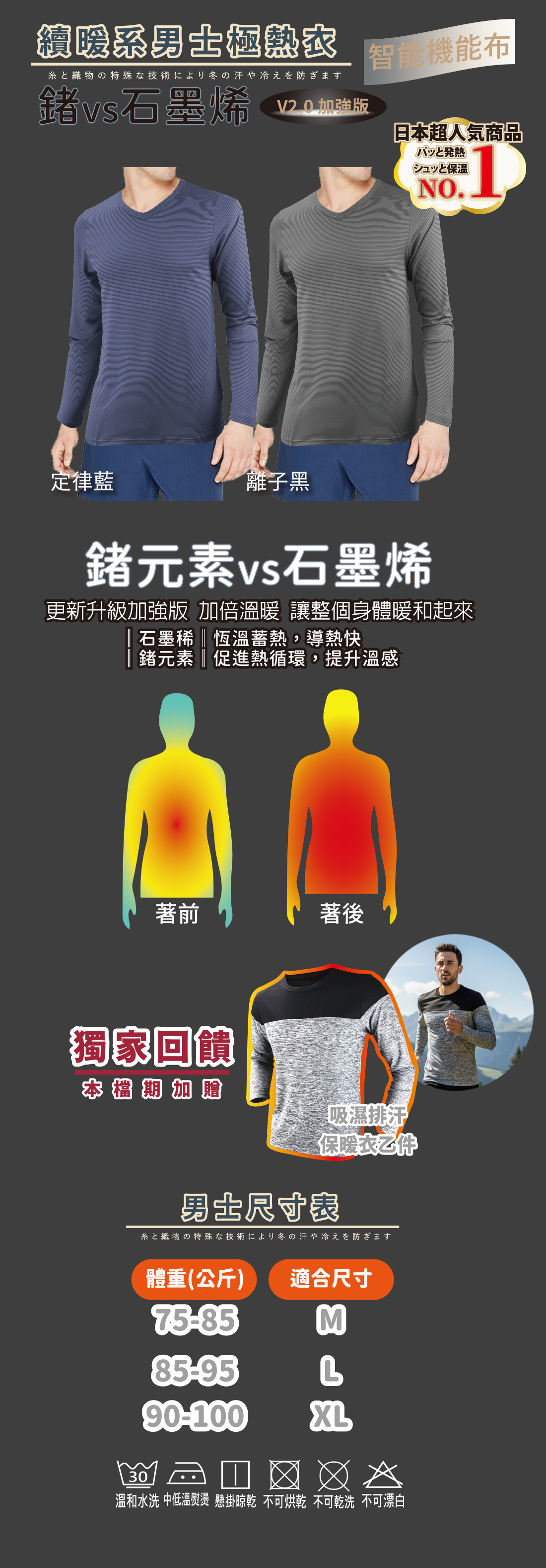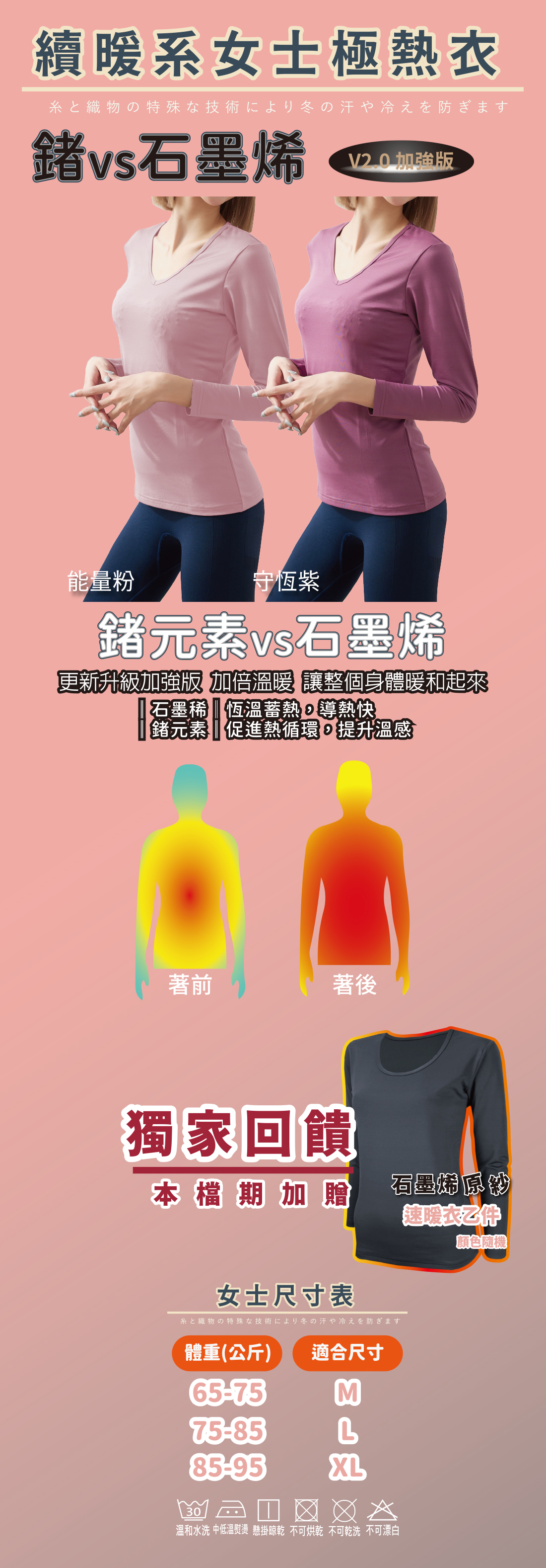.台灣製造.品質保證 .石墨烯+鍺元素.雙倍功效 .3D立體剪裁.貼身舒適 .一組2件裝不挑色 .男款贈[保暖衣]一件 .女款贈[速暖衣]一件 ※顏色固定不拆賣.尺寸不混搭 ※贈品不挑色