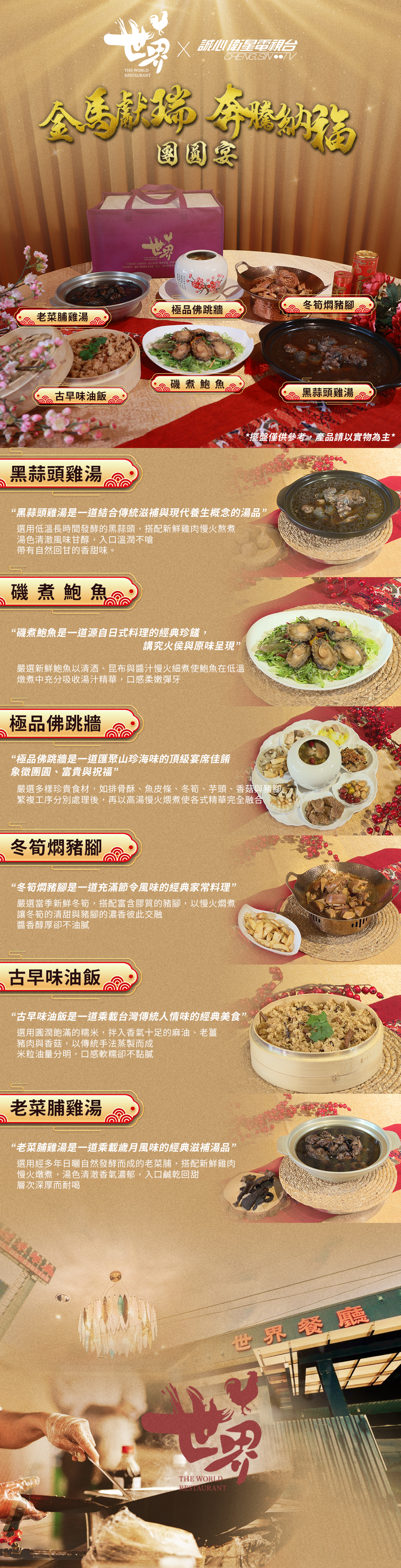 .雲林世界餐廳招牌手路菜 .過年圍爐小家庭首選 .加熱即食輕鬆享用頂級美食 .可冷凍保存90天 .第二套再享折扣 -$480/套