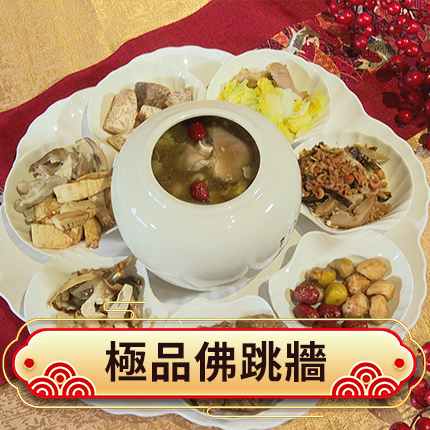 1.蒜香納福金雞湯(黑蒜頭雞湯)2300 g ± 5 % 雞肉、高湯、黑蒜頭、白蒜頭、米酒、塩、糖、雞粉。 用電鍋或瓦斯爐充份加熱即可食用。冷凍90天 2.歲藏甘醇福壽雞(老菜脯雞湯)2300 g ± 5 % 雞肉、高湯、老菜脯、米酒、塩、糖、雞粉。 用電鍋或瓦斯爐充分加熱即可食用。冷凍90天 3.金筍豐蹄旺家運(冬筍燜豬腳)1000g ± 5 % 豬腳圈、冬筍、蔥、蒜仁、醬油、魚露、糖、米酒。 用電鍋或微波爐充分加熱即可食用。冷凍90天 4.福聚滿甕佛跳牆(極品佛跳牆)2000 g ±5 % 排骨酥、扁魚酥、木瓜螺、魚皮、香菇絲、紅棗、豬肚、栗子、珠貝、蔥段、豬腳、芋頭、冬蝦、冬筍、鳥蛋、塩、糖、火腿、高湯、紹興酒。 用電子鍋燉煮一個半小時即可食用。冷凍90天 5.步步高陞吉祥米糕(古早味米糕)600 g ±5 % 糯米、香菇絲、冬蝦、魷魚絲、油蔥酥、五花肉絲、蛋酥、黑麻油、醬油、水、米酒、糖、老薑。 用電鍋或微波爐充分加熱即可使用。冷凍90天 6.富貴紅運鮑滿堂(磯煮鲍魚)300 g ±5 %鮑魚清肉、糖、水、味醂、柴魚、醬油、昆布。 常溫退冰即可拆封食用。冷凍90天